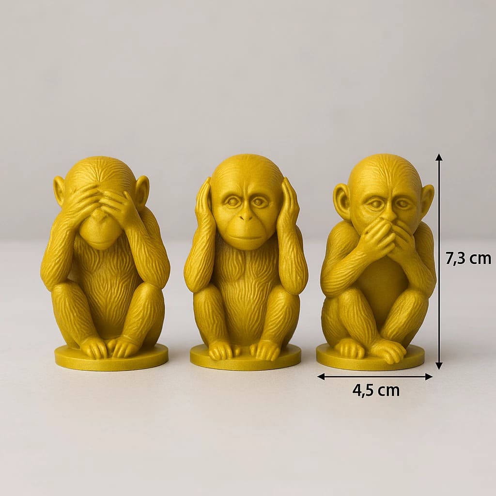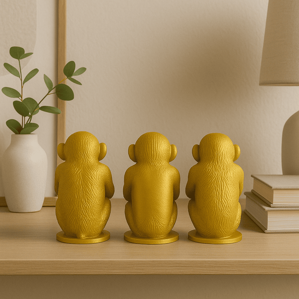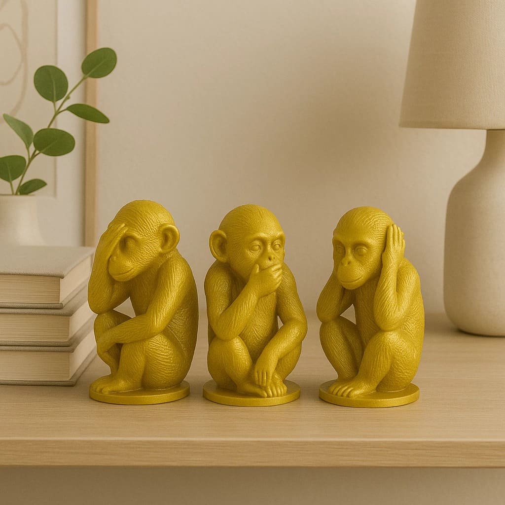 Este Trio de Macacos Sábios em PLA dourado (cego, surdo e mudo) é perfeito para dar um toque sofisticado à sua casa, escritório ou presentear alguém especial.